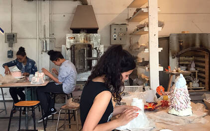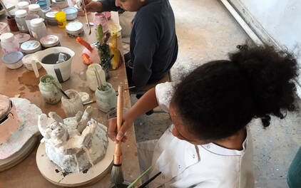 Les élèves créent des volumes en terre et expérimentent des combinaisons de textures et de couleurs.