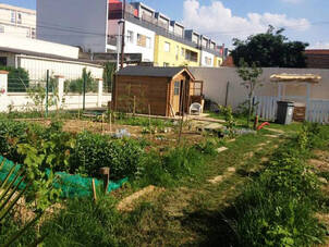 Ce jardin de 900 m2 inauguré en 2022 accueille un poulailler, des arbres fruitiers et une grande zone de potager.
