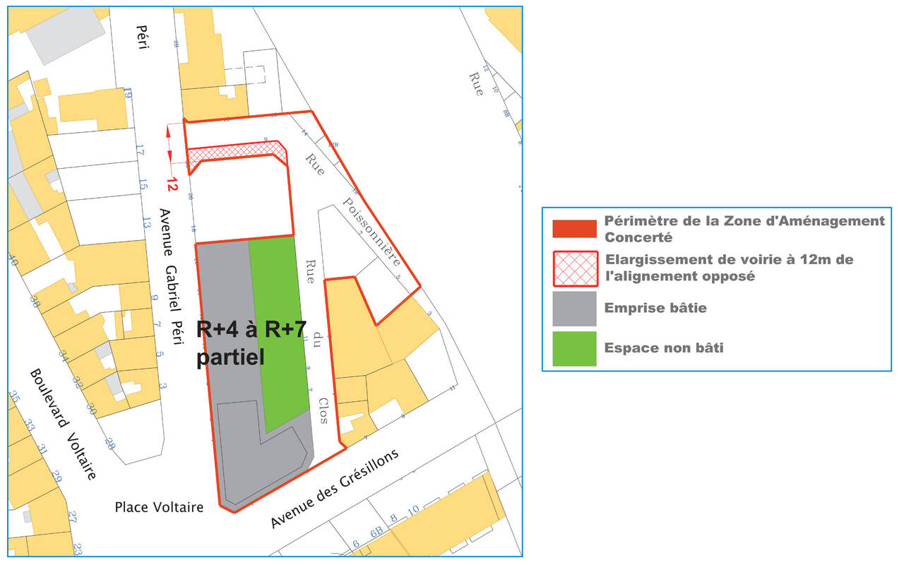 Il est préconisé de construire plus haut dans la partie dégagée du site, à l’angle de la place Voltaire et en harmonie avec le contexte existant ou en projet le long de Gabriel Péri et de la rue Poissonnière.