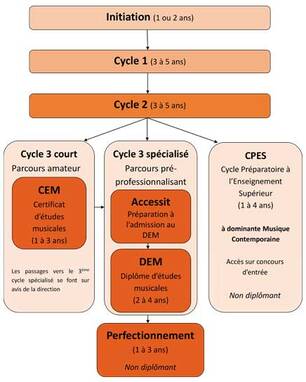 Les élèves peuvent entrer en initiation (1 ou 2 ans) dès l’âge de 7 ans, avant de commencer un cursus en 1er cycle. Ce cursus peut mener l’élève jusqu’à la préprofessionnalisation et la préparation des concours d’entrée dans les établissements d’enseignement supérieur, en France (CNSMD, pôles supérieurs, CEFEDEM, CFMI) ou à l’étranger.