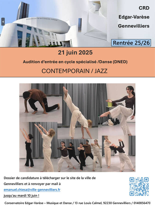 Audition d’entrée en cycle spécialisé /Danse (DNED) - Contemporain/ Jazz : Samedi 21 juin 2025