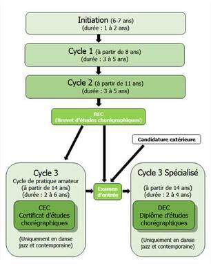 - Cycle menant au Diplôme d’Etudes Chorégraphiques (DEC) : organisé selon un rythme plus soutenu, ayant une orientation professionnelle, il permet de se préparer à passer les épreuves du DEC.